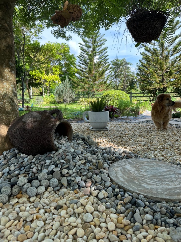 แปลงพื้นที่ใต้ร่มหูกระจง 3 ต้นใหญ่ ต้นเล็กต้นน้อยสู้หูกระจงไม่ไหวเลยต้องปรับเป็นสวนหิน ได้ไอเดียสายน้ำ ลำธาร หินล้น จาก อากู๋ / Pinterest เลยออกแบบเอง กำกับเอง สั่งของเอง โชคดีได้น้องๆ จากหมู่บ้านใกล้ๆ มาช่วย ได้ของราคาใช้ได้จากใน fb เพราะ fb คอยแอบฟังและป้ายยามาตลอด